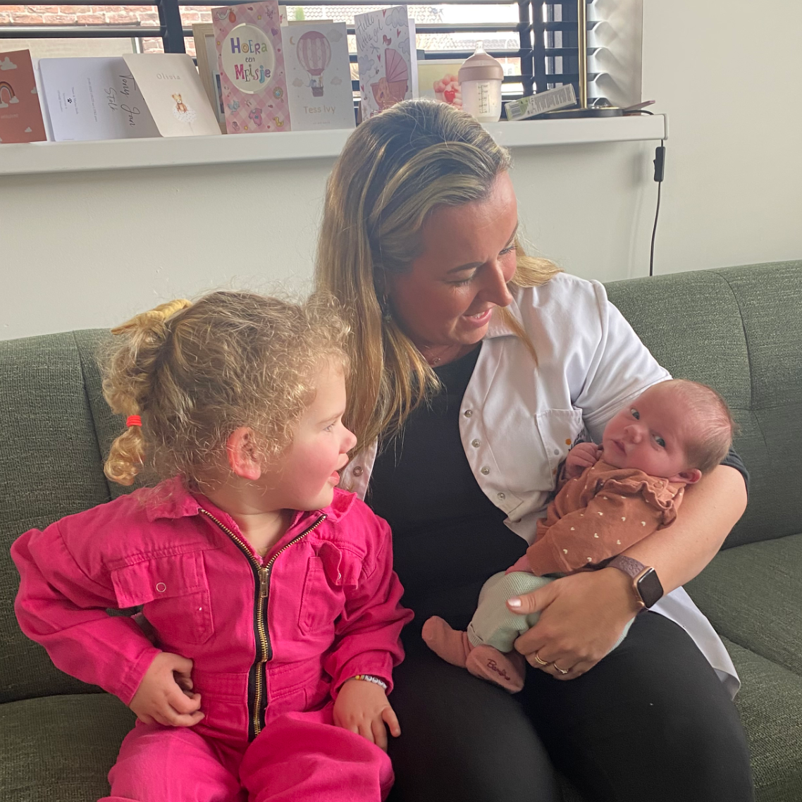 "Wat hebben wij een onwijs fijne kraamweek gehad dankzij jou en wat missen we je! Buiten dat we het ontzettend gezellig hadden met je heb je ons ook alle ruimte gegeven om heerlijk te genieten van onze meiden. Mijn vorige ervaring met borstvoeden was helaas geen succes maar dankzij jou gaat dat nu wel ontzettend goed, wat ben ik je daar dankbaar voor! Ook heb je ons nog allerlei leuke tips gegeven waar we nog lang plezier van zullen hebben!! We raden je iedereen aan en hopen je nog vaak tegen te komen! Liefs van ons."
